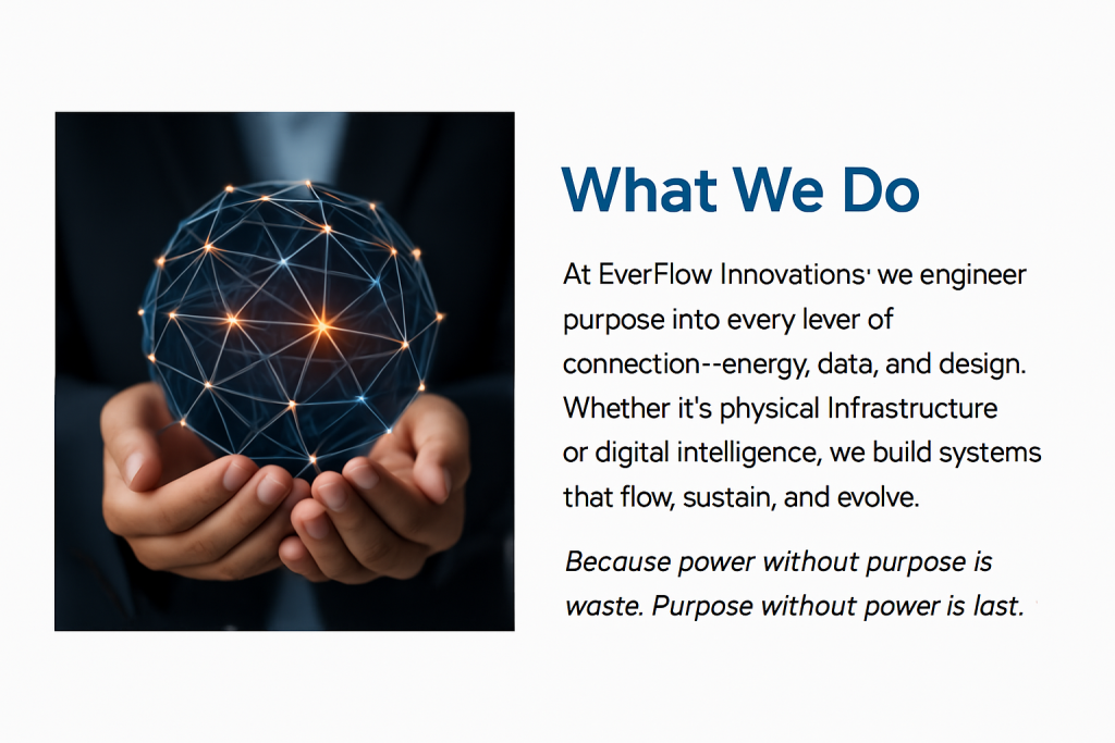 What We Do At EverFlow Innovations, we engineer purpose into every layer of connection—energy, data, and design. Whether it’s physical infrastructure or digital intelligence, we build systems that flow, sustain, and evolve.
